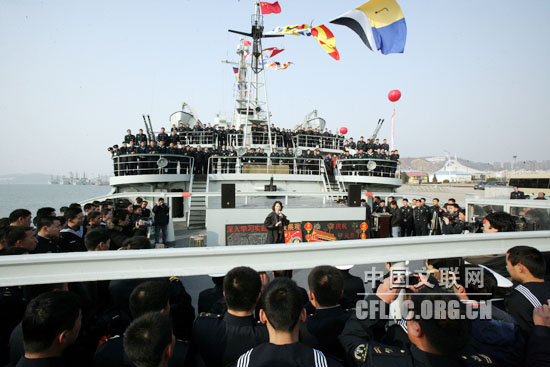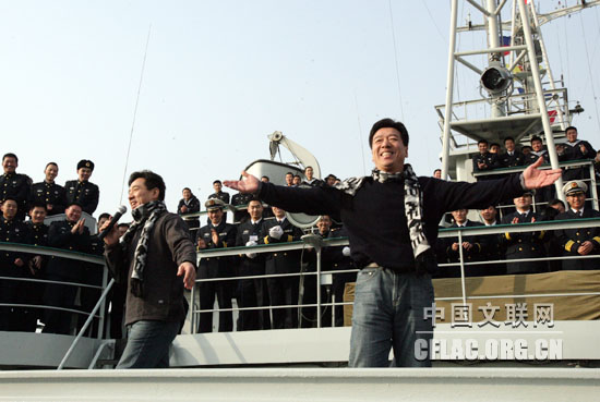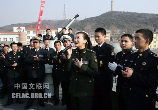 1月1日,中国文联等单位组织艺术家“送欢乐、下基层”,深入旅顺军港为官兵们演出。图为谭晶和官兵们一起高唱《打靶归来》。中国文联网 孟祥宁 摄