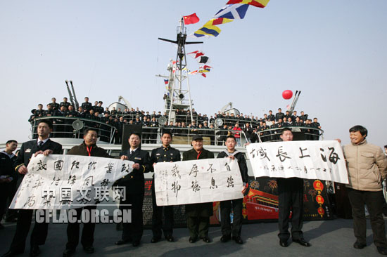 1月1日,中国文联等单位组织艺术家“送欢乐、下基层”,深入旅顺军港为官兵们演出。图为书法家向官兵们赠送书法作品。中国文联网 孟祥宁 摄