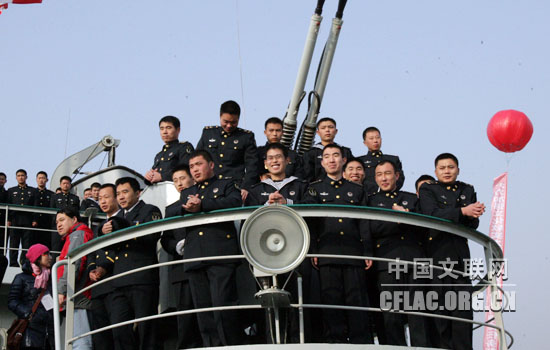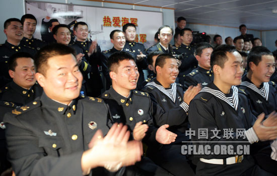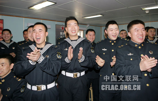 1月1日,中国文联等单位组织艺术家“送欢乐、下基层”,深入旅顺军港为官兵们演出。图为精彩的节目让观众乐开怀。中国文联网 孟祥宁 摄