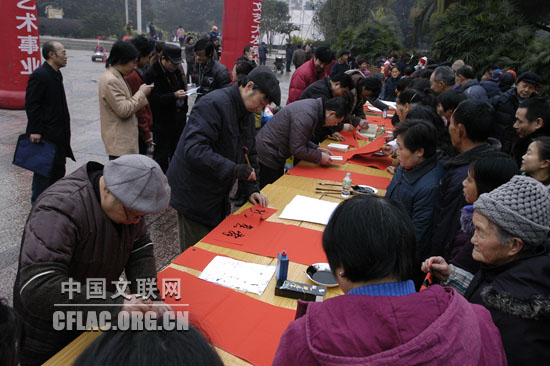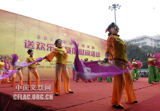日前,重庆市文联和12个市级文艺家协会组织80多名文艺工作者,在重庆隆冬的大雾中,驱车1个多小时赶赴铜梁县开展“送欢乐、下基层”慰问活动。慰问团在为乡亲们献上精彩的文艺节目的同时,还现场制作、免费赠送给群众精美的春联、绘画和剪纸作品。重庆市委宣传部副部长樊伟、市文联党组书记王超参加了此次慰问活动。