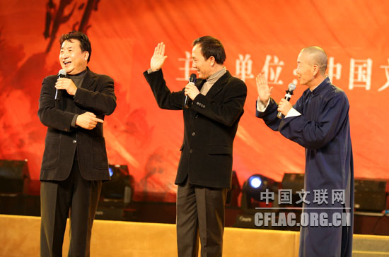 1月12日,由中国文联、中国曲协、中共湖北省利川市市委、利川市人民政府主办的“送欢乐、下基层”走进利川慰问演出活动在湖北省利川市举行。中国文联副主席、中国曲协主席刘兰芳,中国曲协分党组书记、副主席姜昆率领众多文艺家,为当地上千名观众奉献了一场主题鲜明、内容精彩的演出。图为姜昆、戴志诚、赵津生表演群口相声。中国文联网 邱振刚 摄
