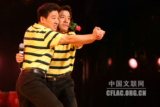 1月12日,由中国文联、中国曲协、中共湖北省利川市市委、利川市人民政府主办的“送欢乐、下基层”走进利川慰问演出活动在湖北省利川市举行。中国文联副主席、中国曲协主席刘兰芳,中国曲协分党组书记、副主席姜昆率领众多文艺家,为当地上千名观众奉献了一场主题鲜明、内容精彩的演出。图为刘全和、刘全利表演滑稽小品《小鸟和蜜蜂》。中国文联网 邱振刚 摄