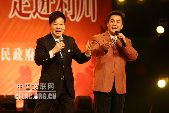 1月12日,由中国文联、中国曲协、中共湖北省利川市市委、利川市人民政府主办的“送欢乐、下基层”走进利川慰问演出活动在湖北省利川市举行。中国文联副主席、中国曲协主席刘兰芳,中国曲协分党组书记、副主席姜昆率领众多文艺家,为当地上千名观众奉献了一场主题鲜明、内容精彩的演出。图为奇志、张伟表演相声《超级播音员》。中国文联网 邱振刚 摄
