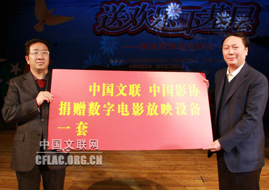 由中国文联、中国影协、广东省文联联合主办的“送欢乐、下基层”系列慰问活动于1月11日至14日在南粤大地的客家之乡河源市举行。12日晚,“送欢乐、下基层”情系河源慰问演出文艺晚会在河源市会议中心举行。中国文联党组成员、副主席杨志今,中国影协分党组书记、驻会副主席康健民以及广东文联的相关领导出席了晚会。晚会上,中国文联、中国影协捐赠数字电影放映设备一套。图为中国文联党组成员、副主席杨志今向河源市委宣传部部长吴善平捐赠。中国文联网 张悦 摄