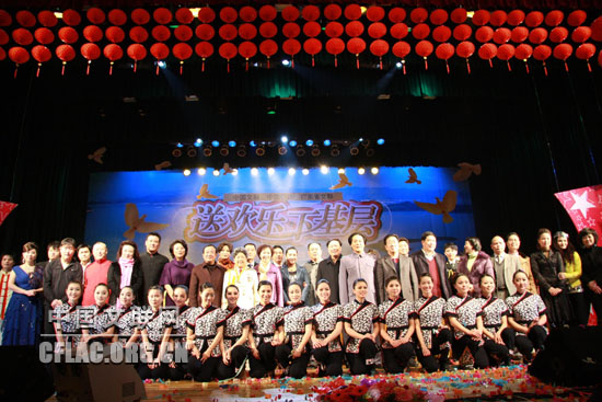 由中国文联、中国影协、广东省文联联合主办的“送欢乐、下基层”系列慰问活动于1月11日至14日在南粤大地的客家之乡河源市举行。12日晚,“送欢乐、下基层”情系河源慰问演出文艺晚会在河源市会议中心举行。图为参加晚会的领导与演员合影。中国文联网 张悦 摄