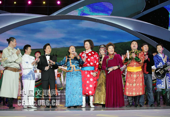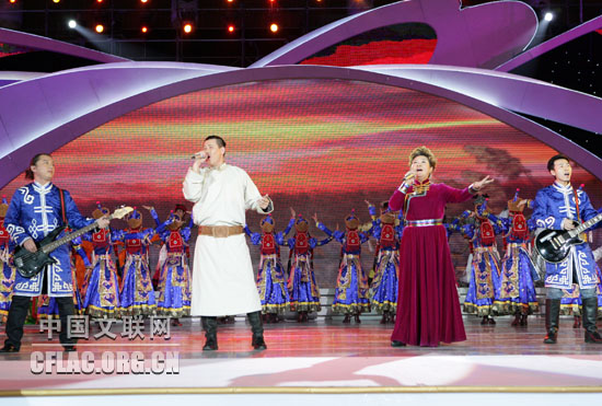 1月17日,“百花迎春——中国文学艺术界2010春节大联欢”在人民大会堂举行。图为阿拉泰额尔古纳乐队表演《鸿雁》。中国文联网 孟祥宁 摄