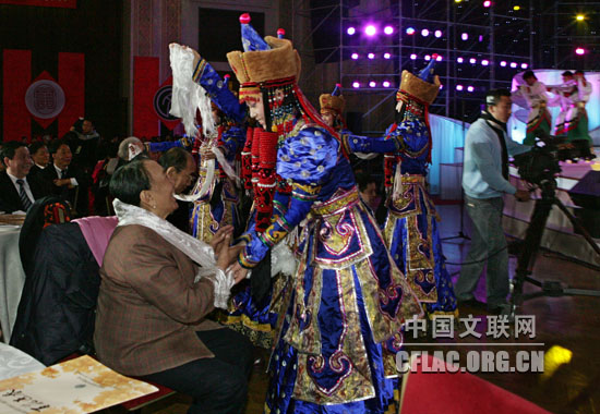 1月17日,百花迎春——中国文联2010春节大联欢在人民大会堂举行。图为演员向艺术家献哈达。中国文联网 孟祥宁