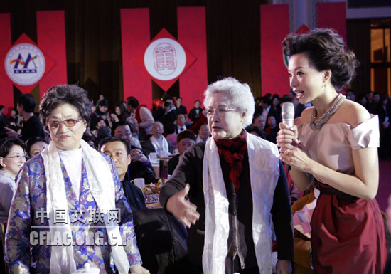 1月17日,百花迎春——中国文联2010春节大联欢在人民大会堂举行。图为主持人现场采访老艺术家。中国文联网 孟祥宁