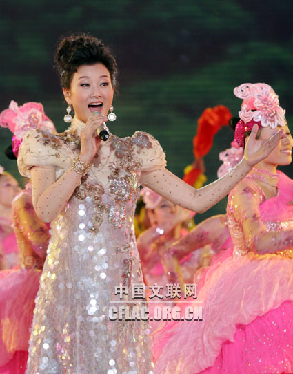 1月17日,“百花迎春——中国文学艺术界2010春节大联欢”在人民大会堂举行。图为宋祖英演唱歌曲《让我们舞起来》。中国文联网 余宁 摄