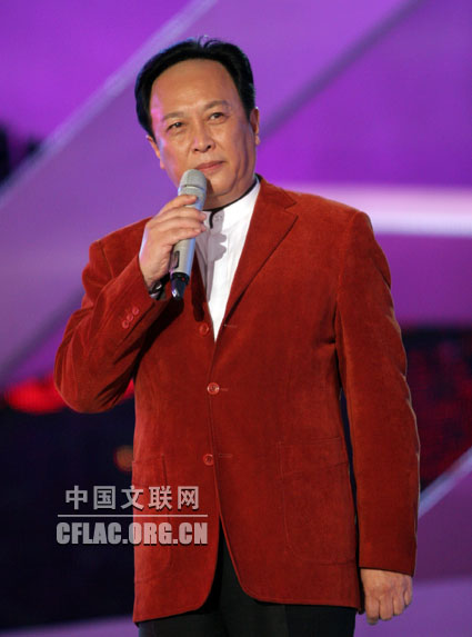 1月17日,“百花迎春——中国文学艺术界2010春节大联欢”在人民大会堂举行。图为唐国强表演配乐诗文朗诵《家乡寄语》。中国文联网 余宁 摄