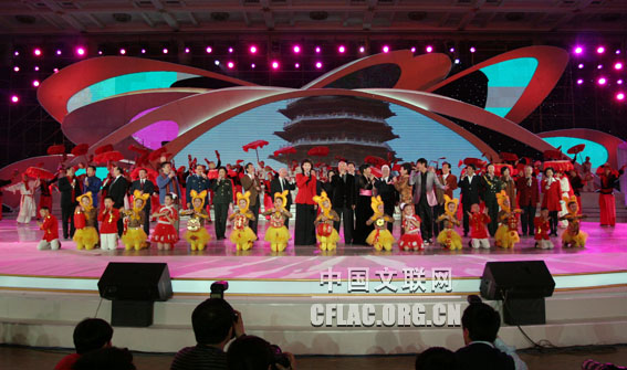 1月17日,“百花迎春——中国文学艺术界2010春节大联欢”在人民大会堂举行。图为乔羽、于洋、吴雁泽等演唱歌曲《谁不说俺家乡好》。中国文联网 余宁 摄