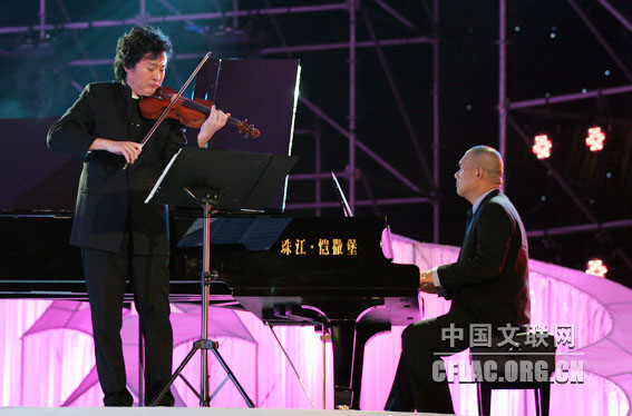 1月17日,“百花迎春——中国文学艺术界2010春节大联欢”在人民大会堂举行。图为吕思清、崔世光表演小提琴和钢琴演奏。中国文联网 余宁 摄