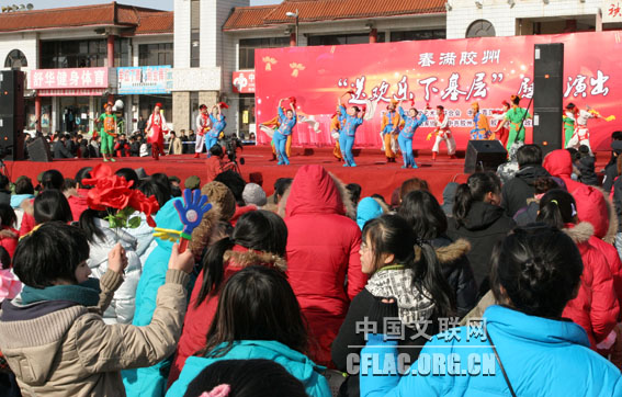 当天下午,艺术家们又深入到位于胶州市郊区的刘家村,把文艺节目送到了农民的家门口。随后,艺术家们又赶到胶州市北关小学,为当地书法、剪纸艺术爱好者现场进行艺术指导,同时为群众写春联、剪窗花,送上了新春的祝福。当晚,艺术家们又在胶州市人民会堂,再次为当地群众奉献了一台精彩的文艺节目。