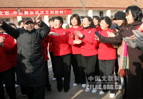 1月21日,由中国文联、中国舞协、青岛市委宣传部主办的“送欢乐、下基层”慰问活动在山东胶州举行。中国文联党组成员、书记处书记廖奔,中国文联荣誉委员、中国舞协名誉主席贾作光,中国文联副主席、中国舞协主席白淑湘,中国舞协分党组书记、驻会副主席冯双白,中国曲协分党组书记、驻会副主席姜昆,中国书协分党组书记、驻会副主席赵长青,胶州市委书记祝华、市长刘赞松等参加了慰问活动。