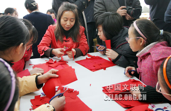 1月21日,由中国文联、中国舞协主办的“送欢乐、下基层”慰问演出活动在山东胶州举行。图为艺术家指导当地小学生剪纸。中国文联网 彭宽 摄