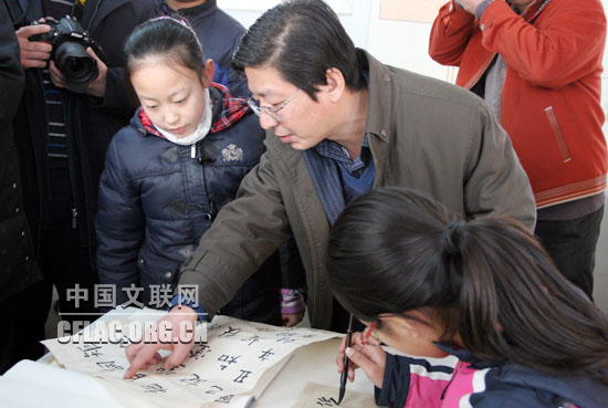1月21日,由中国文联、中国舞协主办的“送欢乐、下基层”慰问演出活动在山东胶州举行。图为艺术家指导当地小学生练习书法。中国文联网 彭宽 摄