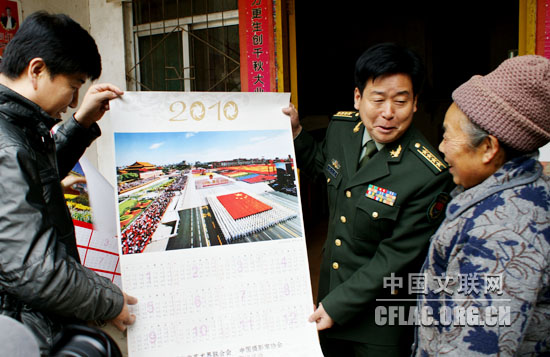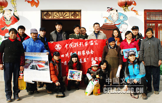 1月20日至22日,由中国摄影家协会副主席张桐胜带队,刘英毅、朱恩光、邓鹏承等摄影家组成的中国摄影家协会“送欢乐、下基层”小分队,与四川省文联党组副书记、副主席陈黔鲁带队的四川省摄影家协会慰问队伍,深入到“5·12”地震极重灾区的北川陈家坝乡、北川中学、绵竹棚花村、什邡蓥华镇、都江堰聚源中学等地,为地震灾区的人们拍摄全家福照片,与所到之地的乡亲们、同学们共同分享灾后重建的喜悦。图为摄影家们在陈家坝乡西溪村向当地居民赠送摄影年历。邓风 摄