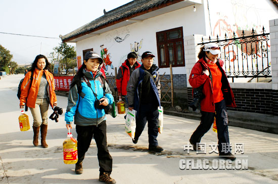 1月20日至22日,由中国摄影家协会副主席张桐胜带队,刘英毅、朱恩光、邓鹏承等摄影家组成的中国摄影家协会“送欢乐、下基层”小分队,与四川省文联党组副书记、副主席陈黔鲁带队的四川省摄影家协会慰问队伍,深入到“5·12”地震极重灾区的北川陈家坝乡、北川中学、绵竹棚花村、什邡蓥华镇、都江堰聚源中学等地,为地震灾区的人们拍摄全家福照片,与所到之地的乡亲们、同学们共同分享灾后重建的喜悦。图为摄影家们为棚花村村民送去大米和食用油。邓风 摄