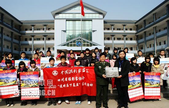 1月20日至22日,由中国摄影家协会副主席张桐胜带队,刘英毅、朱恩光、邓鹏承等摄影家组成的中国摄影家协会“送欢乐、下基层”小分队,与四川省文联党组副书记、副主席陈黔鲁带队的四川省摄影家协会慰问队伍,深入到“5·12”地震极重灾区的北川陈家坝乡、北川中学、绵竹棚花村、什邡蓥华镇、都江堰聚源中学等地,为地震灾区的人们拍摄全家福照片,与所到之地的乡亲们、同学们共同分享灾后重建的喜悦。图为张桐胜向蓥华八一中学赠送摄影集。邓风 摄