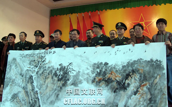 由中国文联、中国美协主办的“送欢乐、下基层”慰问活动于1月28日在广州军区某师举行。中国文联党组成员、副主席冯远,中国美协分党组书记、驻会副主席吴长江,中国美协副主席、广东画院院长许钦松,中国美协秘书长刘健,解放军总政治部艺术局副局长李翔以及相关部队领导和负责人等参加了慰问活动。图为艺术家展示美术作品。中国文联网 段泽林 摄
