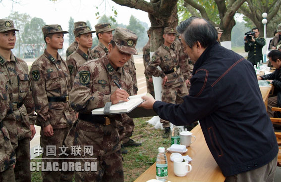 由中国文联、中国美协主办的“送欢乐、下基层”慰问活动于1月28日在广州军区某师举行。中国文联党组成员、副主席冯远,中国美协分党组书记、驻会副主席吴长江,中国美协副主席、广东画院院长许钦松,中国美协秘书长刘健,解放军总政治部艺术局副局长李翔以及相关部队领导和负责人等参加了慰问活动。图为艺术家与官兵现场交流。中国文联网 段泽林 摄
