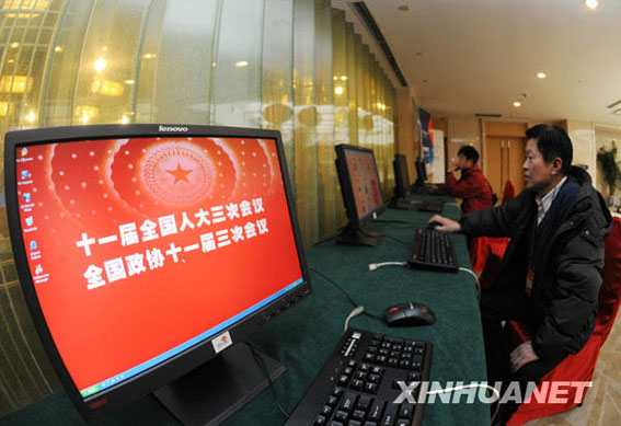 2月26日,一位工作人员在两会新闻中心内上网。新华社记者 金良快摄
