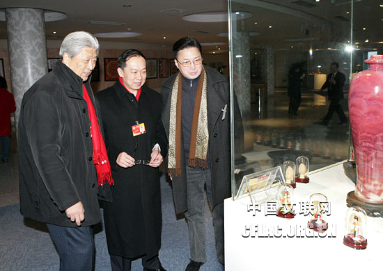 3月2日,2010年文艺界全国人大代表全国政协委员联谊会在中国文联新址中国文艺家之家举行。图为文艺界代表委员参观中国文艺家之家大厅展品。中国文联网 孟祥宁 摄