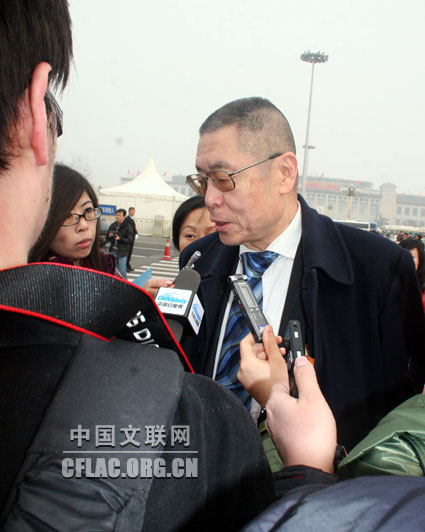 3月3日下午,中国人民政治协商会议第十一届全国委员会第三次会议在北京人民大会堂开幕。图为刘诗昆委员接受媒体采访。中国文联网 吴月玲 摄