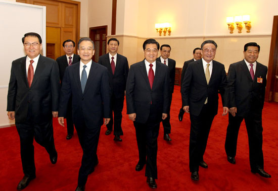 3月3日下午,中国人民政治协商会议第十一届全国委员会第三次会议在北京人民大会堂开幕。这是党和国家领导人胡锦涛、吴邦国、温家宝、贾庆林、李长春、习近平、李克强、贺国强、周永康等步入会场。新华社记者 兰红光 摄