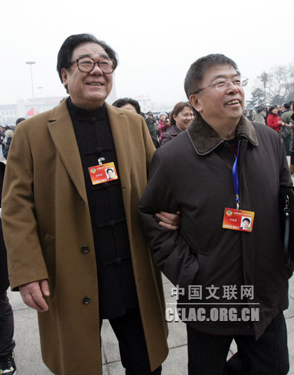 3月3日下午,中国人民政治协商会议第十一届全国委员会第三次会议在北京人民大会堂开幕。图为金铁霖委员(左)和刘锡津委员步入人民大会堂。中国文联网 孟祥宁 摄