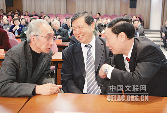 3月2日,2010年文艺界全国人大代表全国政协委员联谊会在中国文联新址中国文艺家之家举行。图为中国文联党组副书记、副主席李牧(中),文化部副部长杨志今(右)与文艺界代表委员畅谈文艺发展。中国文联网 余宁 摄