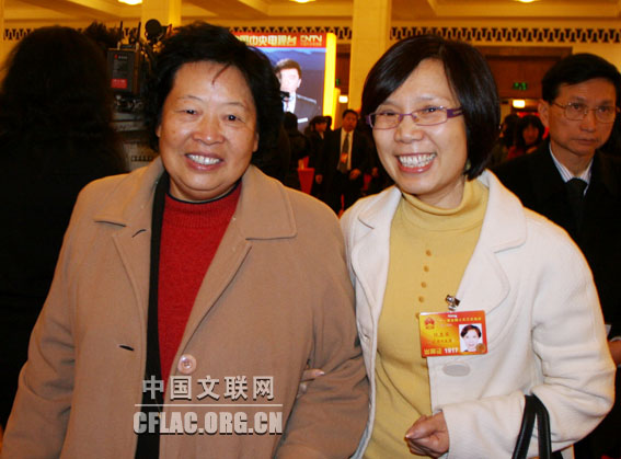 第十一届全国人民代表大会第三次会议3月5日上午在人民大会堂开幕。图为倪惠英代表(右)兴奋地走出会场。中国文联网 余宁 摄