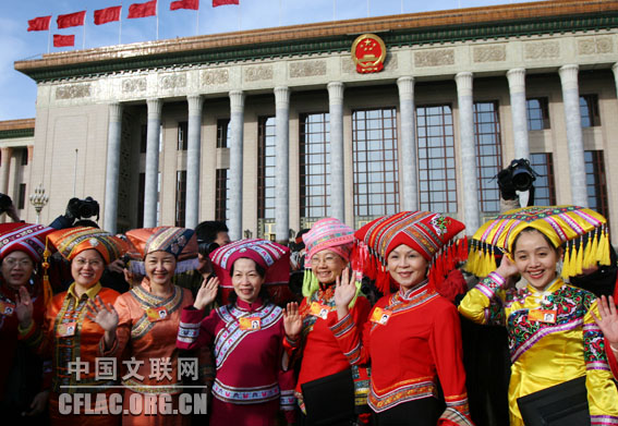 第十一届全国人民代表大会第三次会议3月5日上午在人民大会堂开幕。图为部分身着盛装的少数民族代表成为人民大会堂前一道美丽的风景线。中国文联网 余宁 摄