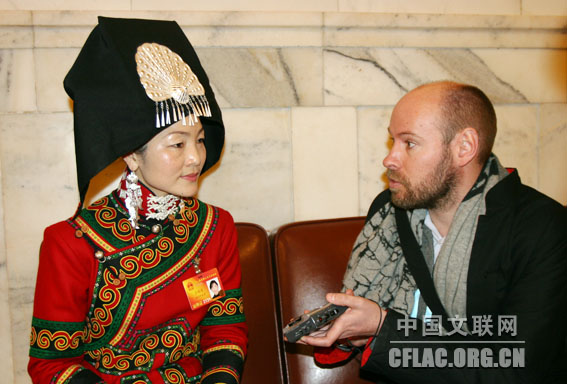 第十一届全国人民代表大会第三次会议3月5日上午在人民大会堂开幕。图为来自四川的羌族代表李为国接受记者采访。中国文联网 余宁 摄