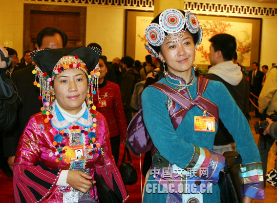 第十一届全国人民代表大会第三次会议3月5日上午在人民大会堂开幕。图为倪惠英代表(右)兴奋地走出会场。中国文联网 余宁 摄