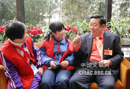 3月5日,委员接受小记者采访。中国文联网 孟祥宁 摄