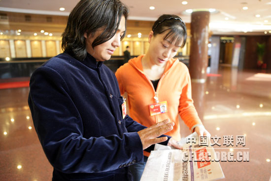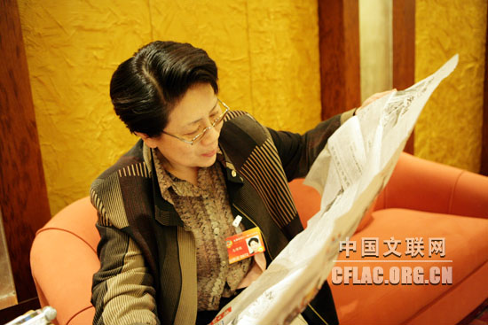 马博敏委员翻阅《中国艺术报》。中国文联网 孟祥宁 摄