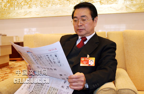 3月10日,黄格胜委员翻阅《中国艺术报》。中国文联网 余宁 摄