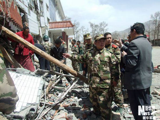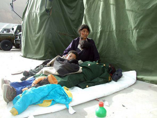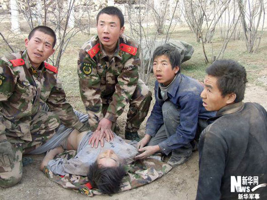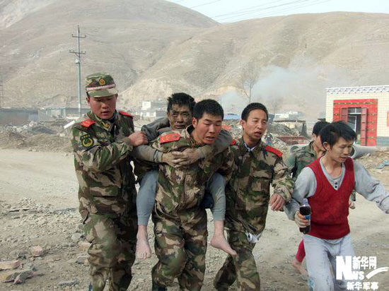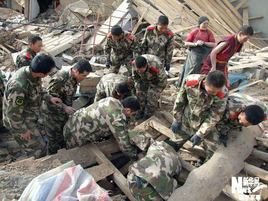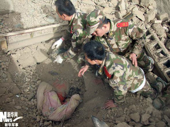 武警玉树支队在自身营房受损的情况下,迅速组织救援,在大型机械设备未到达的情况下,截止14日20时,当日徒手从废墟中挖出960名群众,其中遇难群众遗体62具,同时在营区开设了临时伤员收治所和遇难群众遗体存放点,为抢救人民群众的生命赢得了宝贵的第一时间。(李恩权、于文群、张守国摄影报道)
