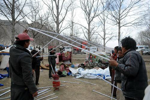 4月15日,几名灾区群众正在搭建帐篷。青海玉树地震发生后,救援工作迅速展开,灾区居民群众积极展开自救工作。新华社记者 吴光于 摄