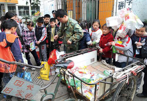 4月15日,湖北黄石市磁湖小学的学生通过回收旧书、旧课本、空矿泉水瓶等废品,为玉树地震灾区筹得善款3000多元。新华社发(邱孝威 摄)