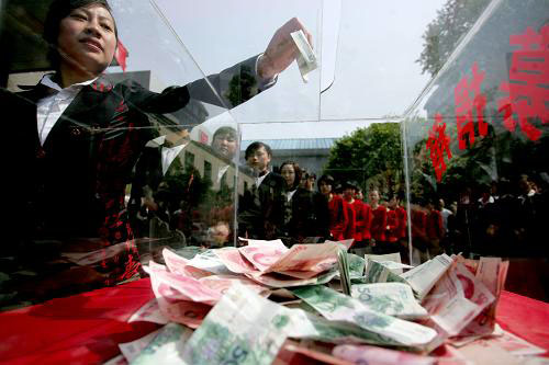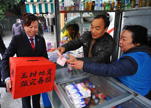 4月15日,温州华盖山服装市场商户向地震灾区捐款。当日,浙江省温州市华盖山服装市场开展向玉树地震灾区捐款活动,百余家商户共募集捐款9445元,这些善款将通过温州红十字会转往灾区。新华社发(余日迁 摄)