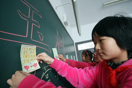 4月15日,同学们在捐款活动中写下鼓励灾区小朋友的卡片,这些卡片将随善款一起被送往灾区。当日,天津市中营小学开展“情系玉树 奉献爱心”捐款活动,同学们纷纷将自己的零花钱捐出,用于帮助地震灾区的小朋友。新华社发(刘东岳 摄)