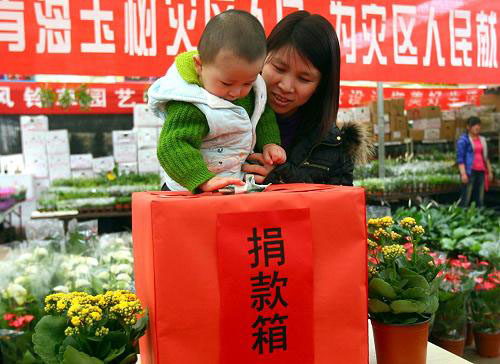 4月15日,北京市丰台区花乡黄土岗村的花农为青海玉树地震灾区捐款。新华社发(汝涛 摄)