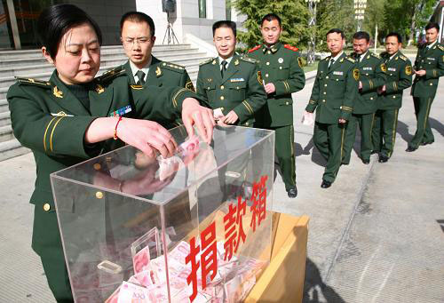 4月15日,武警西藏总队组织机关干部向青海玉树地震灾区捐款,共募得善款5万余元。新华社发(张权 摄)