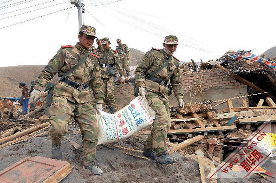 4月17日,武警青海总队第一支队的战士在搬运从废墟中挖出的粮食。