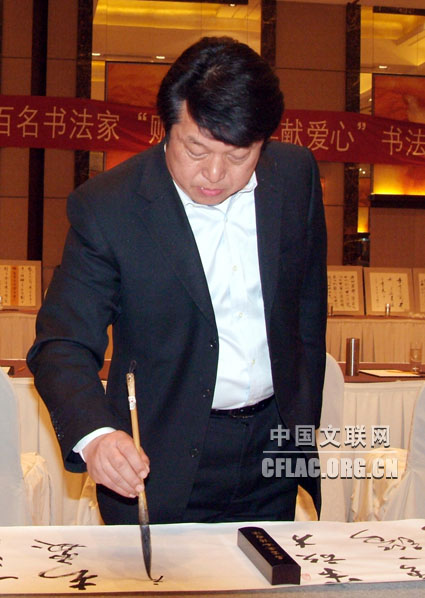 4月16日下午5点,中国书协百名书家“赈灾救助共献爱心”百米长卷捐赠仪式在京举行,中国书协向中华慈善总会捐赠了百名书法家现场创作的百米长卷用于赈灾救助,并决定向青海省文联捐善款50万元人民币,向灾区人民表达书法界的一片深情厚谊。中国文联党组书记、副主席胡振民,中国文联党组副书记、副主席覃志刚,中华慈善总会副会长邓铜山,中国文联副主席、中国书协副主席段成桂,中国书协分党组书记、驻会副主席赵长青,中国民协分党组书记、驻会副主席罗杨,中国书协副主席聂成文、申万胜、言恭达、吴东民、吴善璋、邵秉仁,中国书协副秘书长白煦,中国美协副秘书长张旭光,中华慈善总会新闻办公室主任张银俊等以及参加活动的百余名书法家出席了捐赠仪式。图为中国文联党组副书记、副主席覃志刚参加百米长卷创作。中国文联网 冉茂金 摄