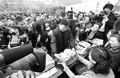 王西京出现时,手上并没有作品,而是拎着一个红色的袋子。看王西京有点吃力的样子,袋子重量似乎不轻,不像是普通的书画作品。正当围观的市民纷纷猜测袋子是什么的时候,王西京将袋子放到了舞台的收银处。“哗……”当看到袋子里的物品时,全场顿时响起一阵如雷般的掌声,袋子里是成沓的百元现金,总共60万元。王西京表示,玉树是西安中国画院的采风基地,这几年来,画家们14次下到青海,并在玉树地区捐建希望小学,陕西的画家和青海人民有着难以割舍的情结,“不在乎我们捐出多少钱,我们只希望可以和灾区人民一起共渡难关,一起共建我们的精神家园。”