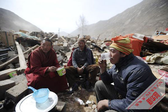 4月18日,在玉树县结古镇,几位受灾群众在休息。当日,青海省玉树地震发生后第五天,在临时居住点暂时安顿下来的受灾群众,在废墟旁生火做饭,晾晒牛肉,灾后生活正在逐步展开。新华社记者 江宏景 摄