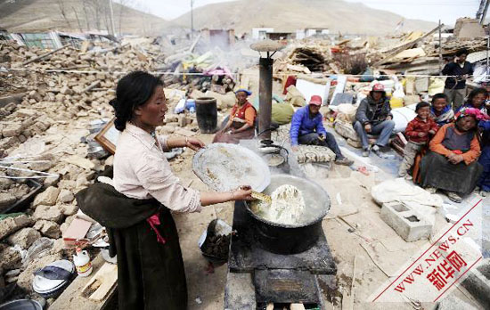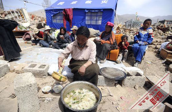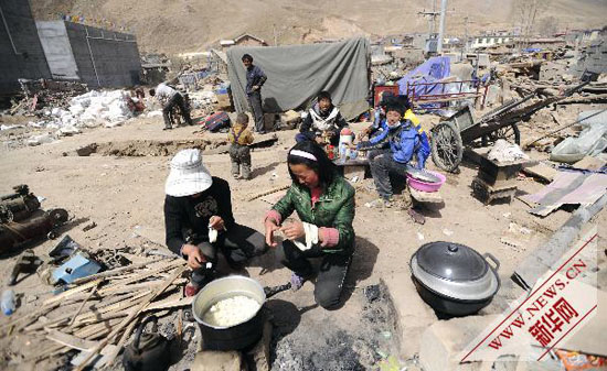 4月18日,在玉树县结古镇,几位受灾群众在准备午餐。
